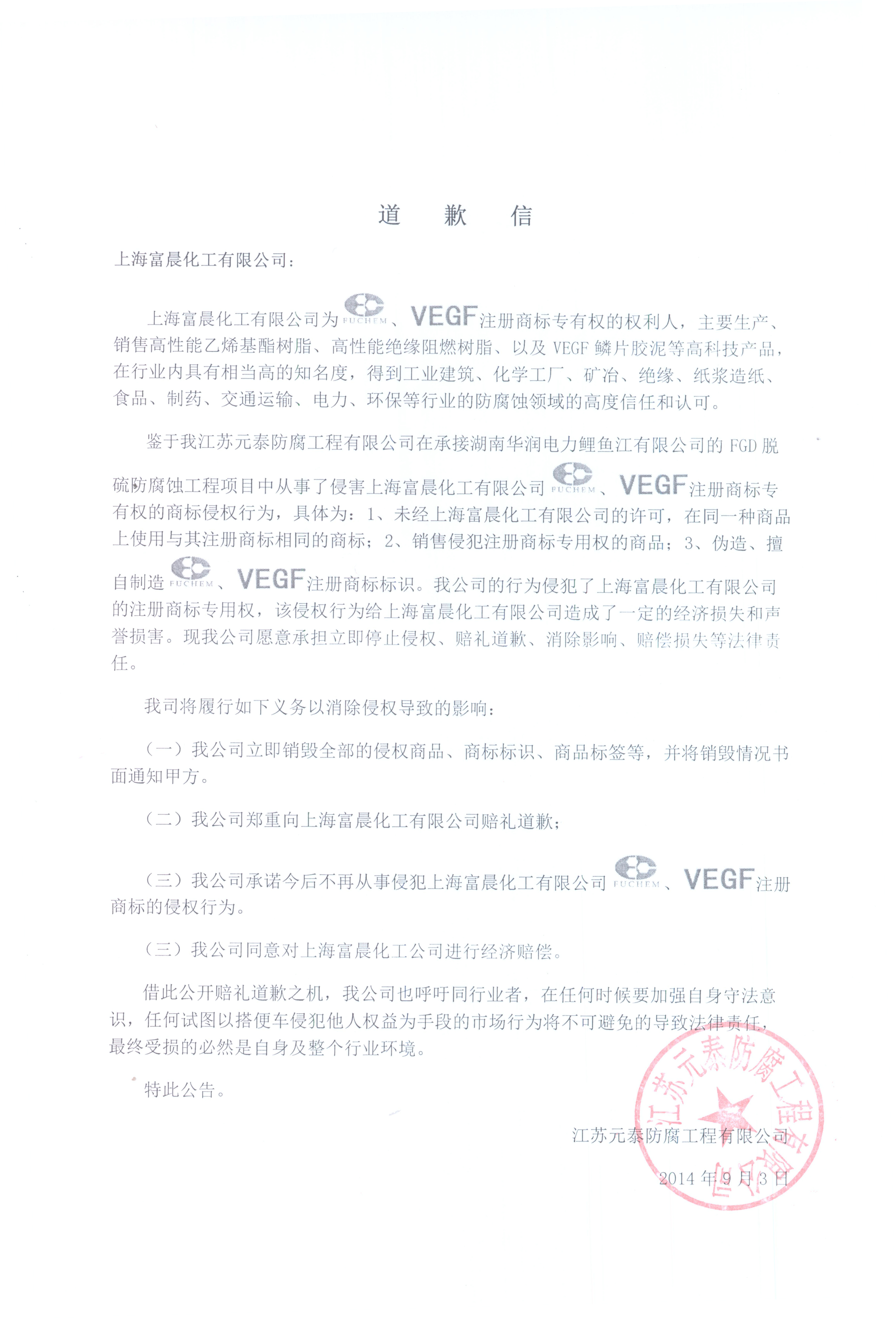 江苏元泰防腐工程有限公司致上海富晨化工有限公司道歉信