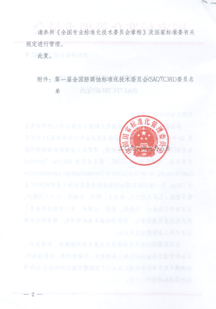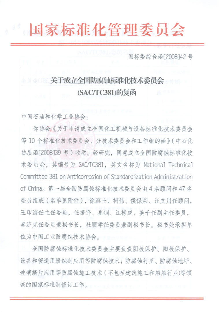 经过协会十多年坚持不懈的努力,中国国家标准化管理委员会于2007年12月19日批准筹建全国防腐蚀标准化技术委员会。筹建期间,得到了国家质检总局领导的大力支持和指导,我国防腐界几乎所有的中国科学院和中国工程院院士都表示积极支持并愿意出任标委会顾问。秘书处承担单位——中国工业防腐蚀技术协会提交的筹建方案于2008年5月8日得到了国标委的批准,当月召开了全国防腐蚀标准化技术委员会成立大会,中国工程院徐滨士院士、国家质检总局领导和全国标委会有关领导光临大会指导,全国防腐蚀标准化技术委员会(SAC/TC381)正式成立。这是防腐蚀行业发展的重要突破。